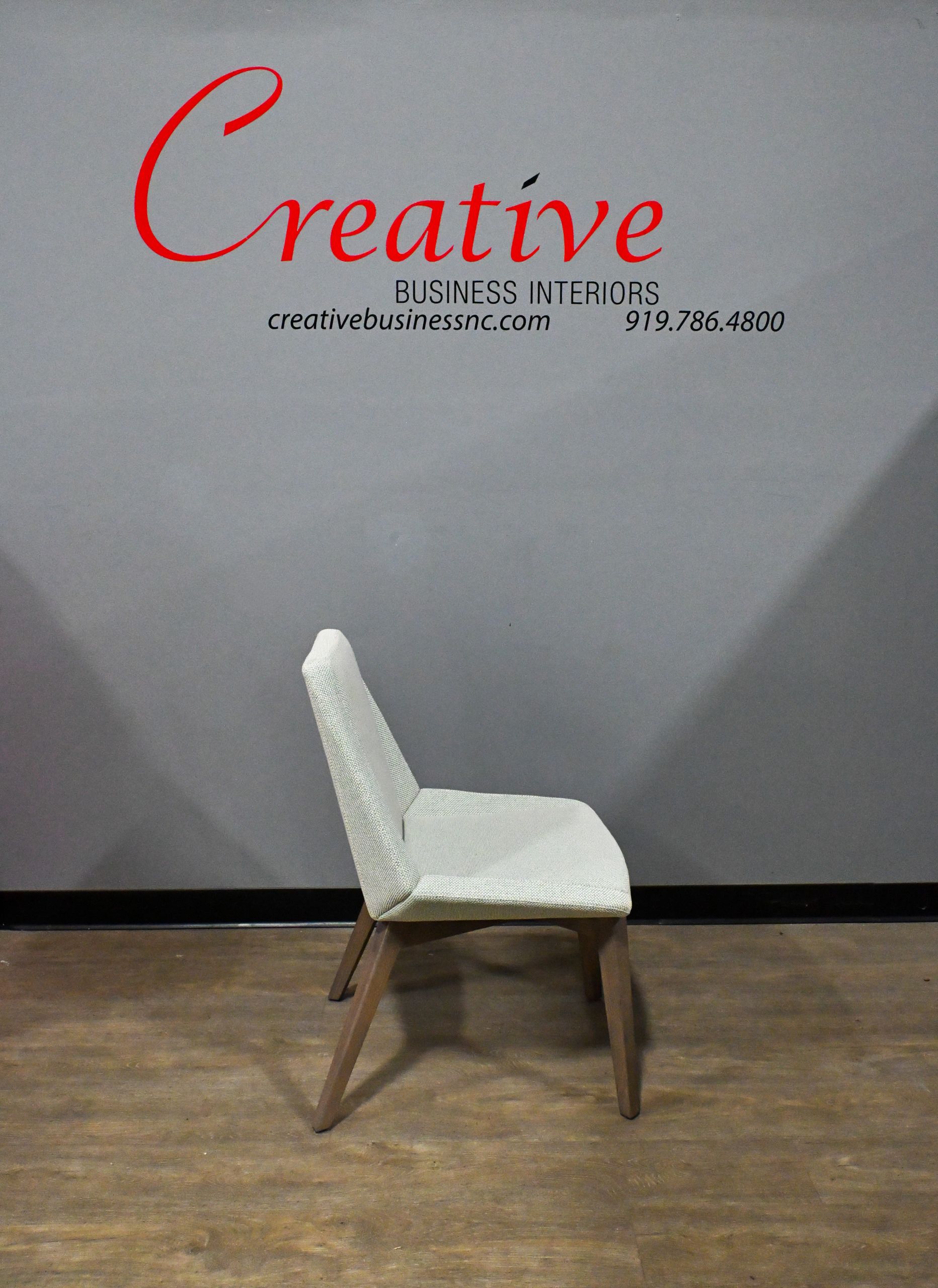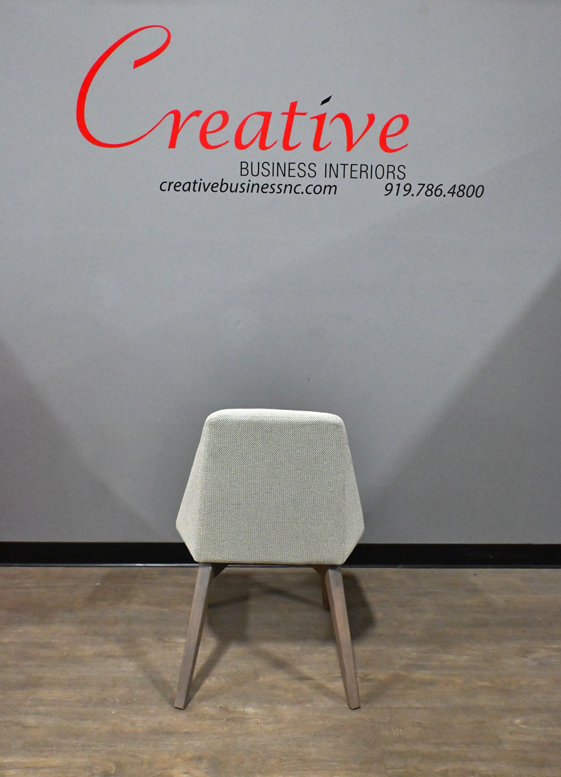 Arcadia Nios Side Chair with light green fabric body and wooden legs.