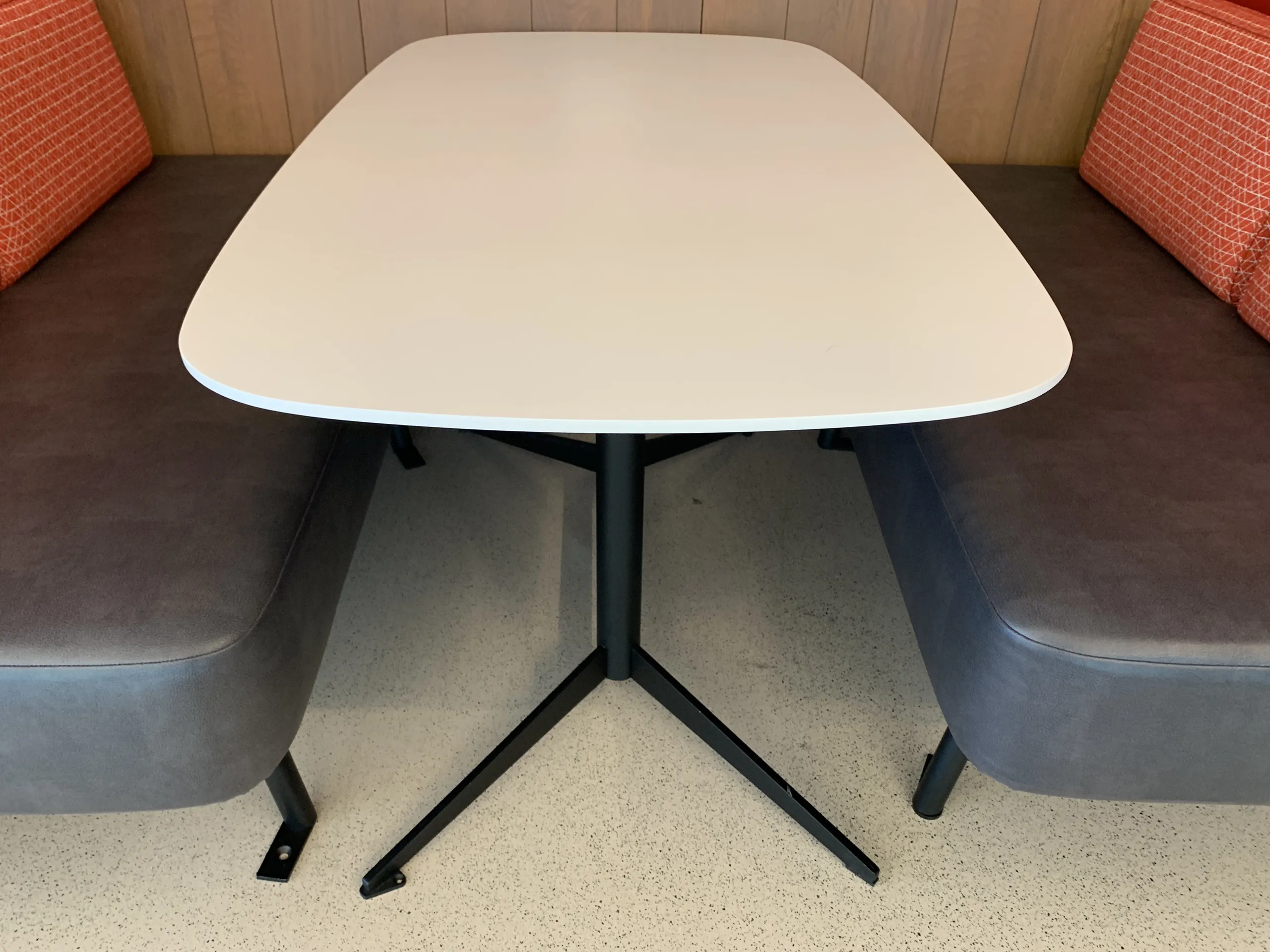 Davis Mez Table, custom sized, 54″W x 30″D x 29″H with white top and black base.
