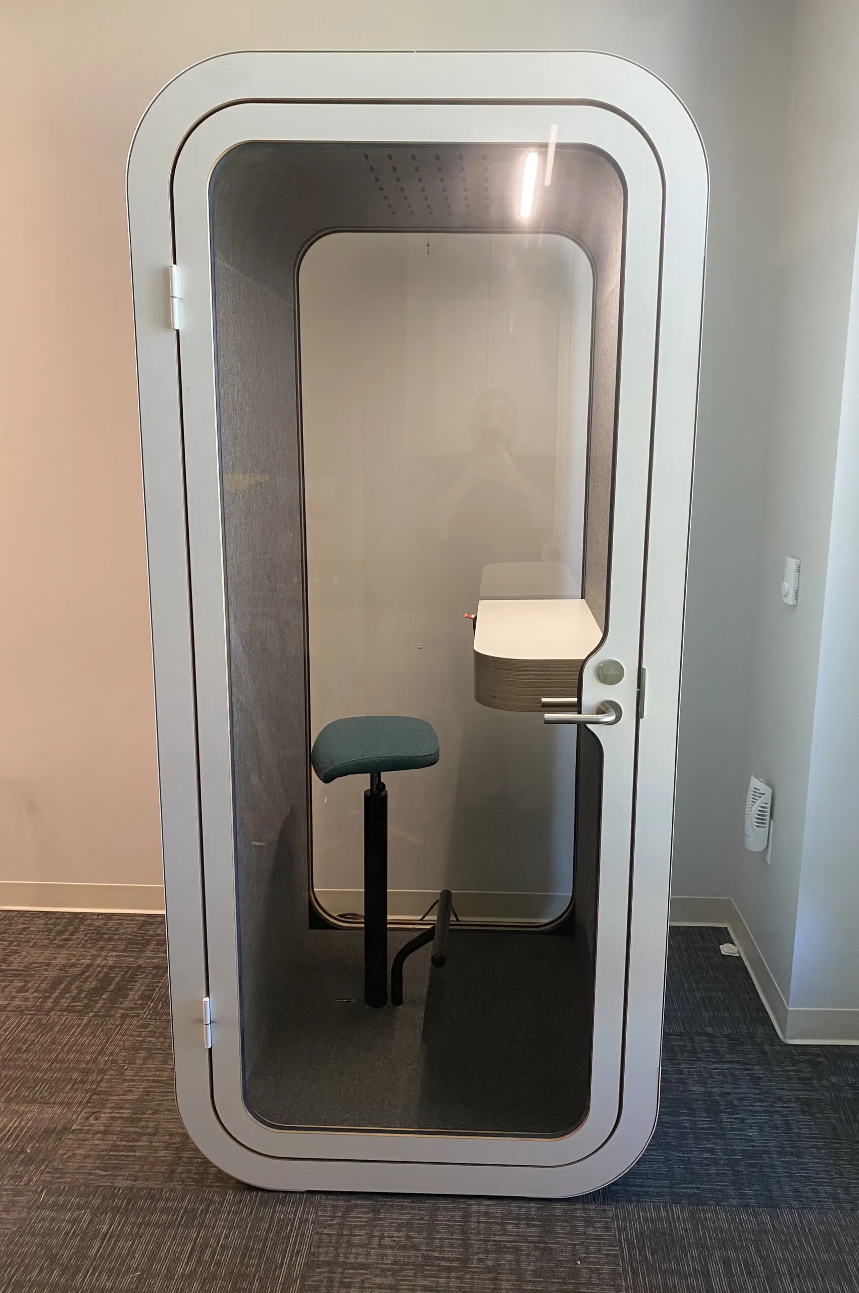 Framery Single Pod, measures 39 ½” square and 87” tall. Pre-wired data access from top of the unit.