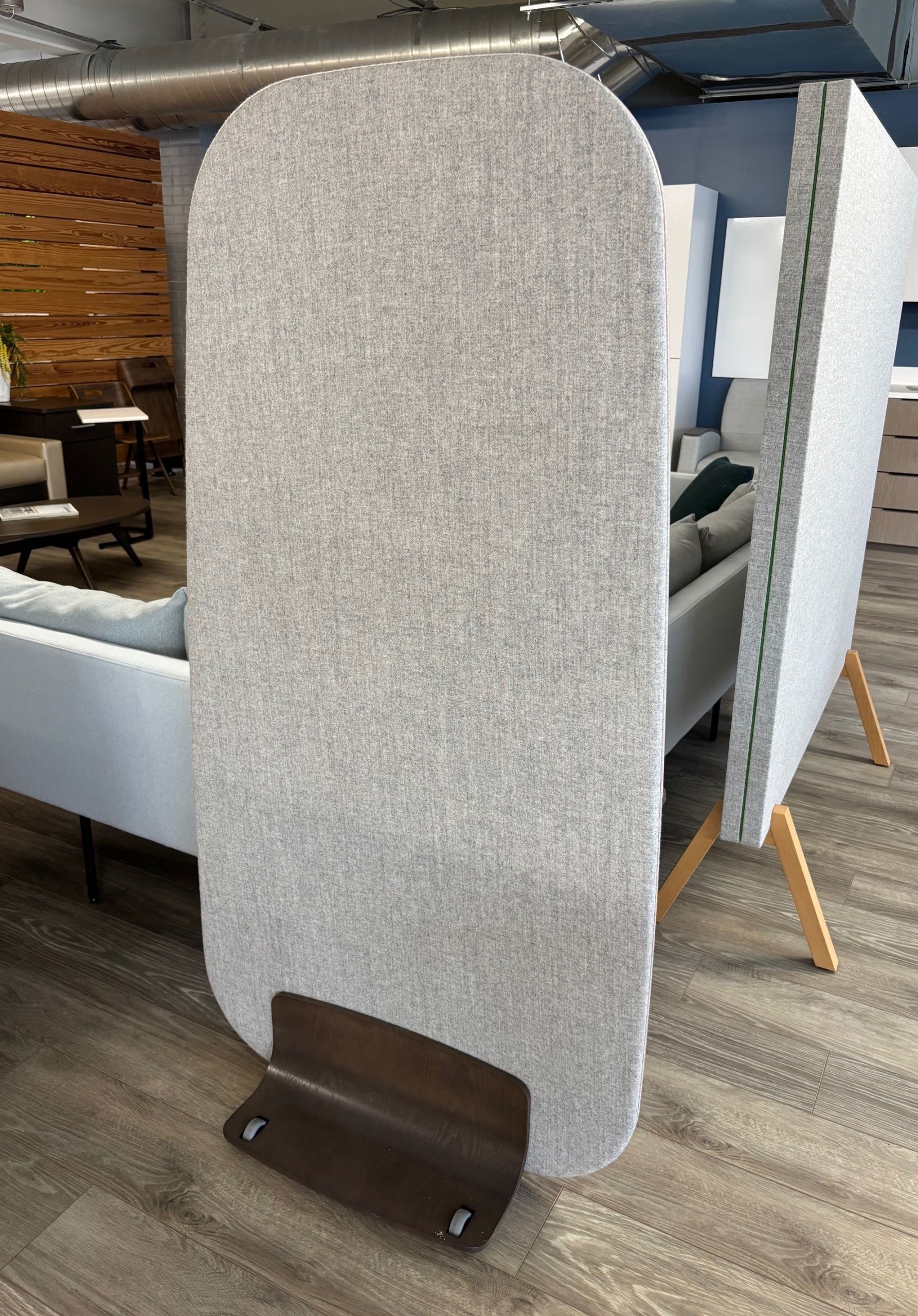 Kimball Paradolia Mobile Screen with light gray fabric and wooden base, on casters. Markerboard on one side.