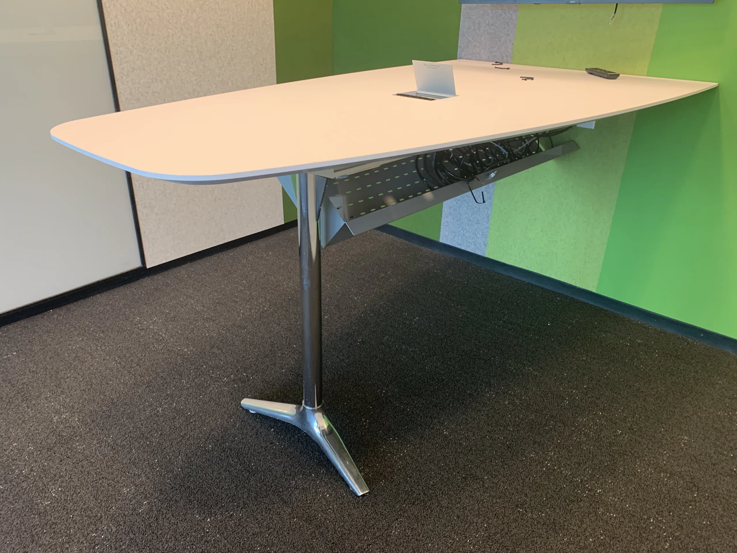 Neinkamper Gateway Huddle Table, standing height table, power plugs in at wall 84″W x 24″D expands to 46″ at the wall x 42″H. White laminate top with electrical insert and chrome post on narrow end. Mounted to the wall on the other end.