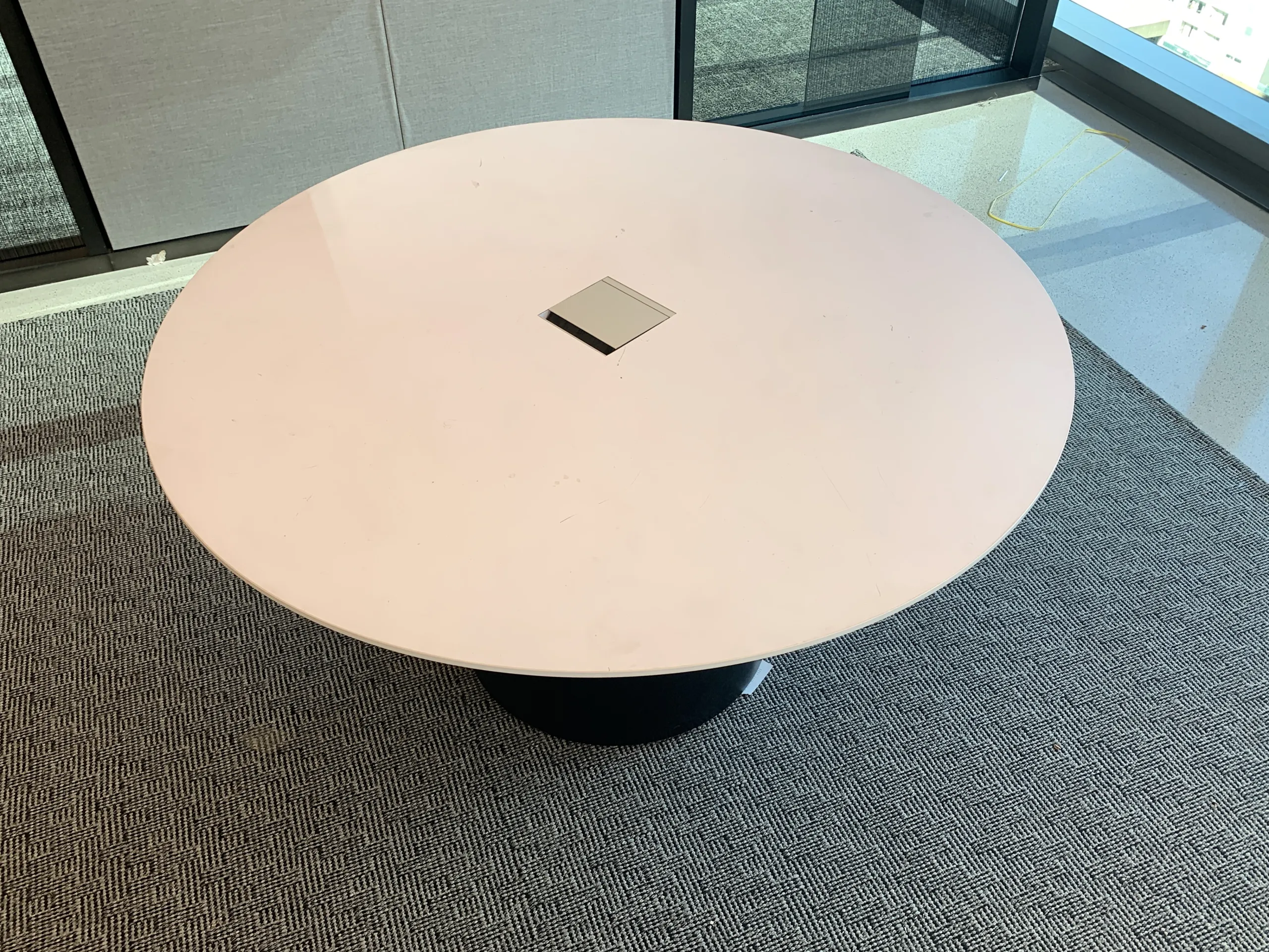 Neinkamper Meeting Table with white laminate top and cone base, hardwire 54″ diam.